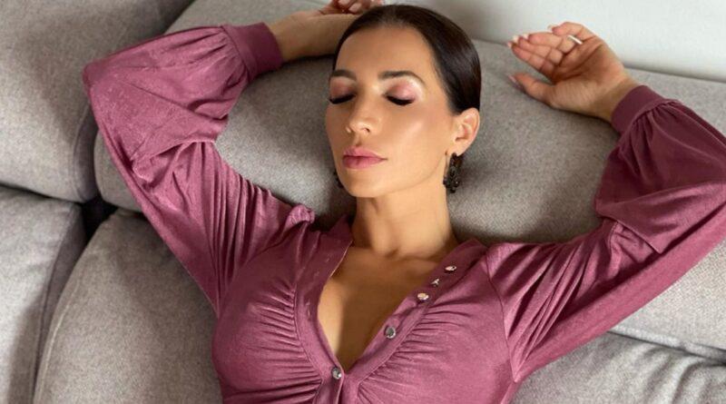 In the image, we can see the Spanish woman sitting, right in front of the camera, as she raises her arms, and makes us witnesses of her great charms, beautifully accentuated by her outfit.
